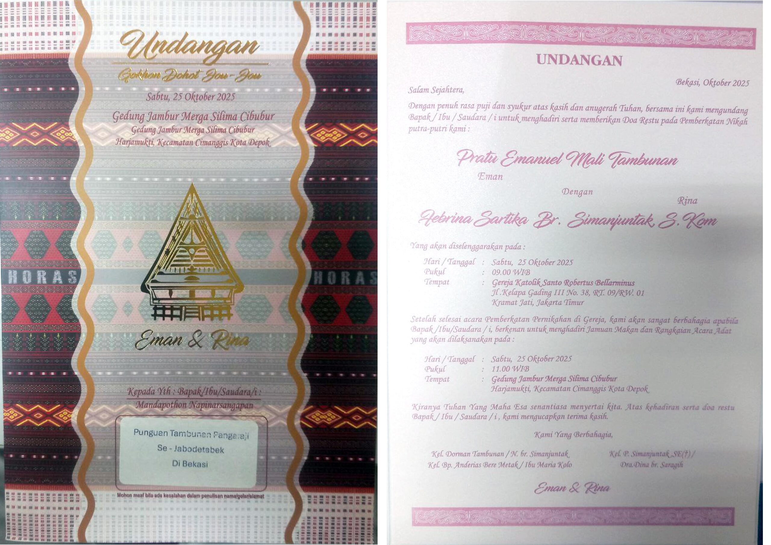 Elisabet br. Tambunan, ST dohot Legino Natanael Gonggom Panjaitan, ST., Msc, MBA Hari/Tanggal : Sabtu, 18 Oktober 2025 Pukul : 08.30 WIB Tempat : Gereja HKBP Pondok Bambu